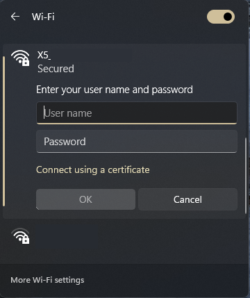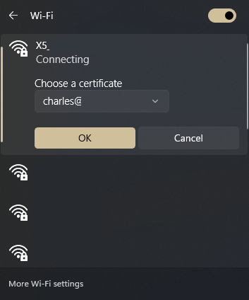 EAP-TLS만 EAP 방법으로 사용할 수 있기에 인증서 배포(설치)를 마치고 무선랜에 연결하면 자격 증명 하단에 "인증서를 사용하여 연결"이 생김