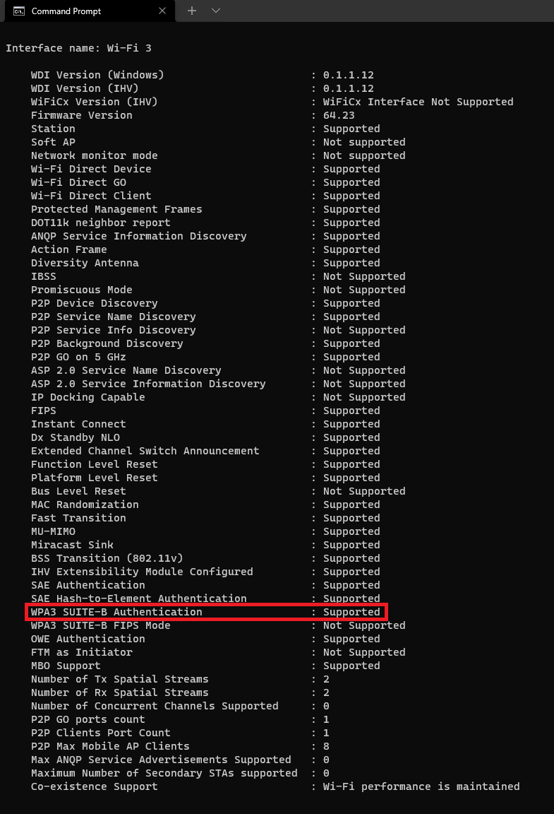 * Windows 디바이스의 경우 FT-AKM으로 연결할 경우 PMF Required이더라도 WPA2-Enterprise로 표기되고 있음. (SHA2-AKM with PMF Required으로 연결할 경우 WPA3-Enterprise로 정상적으로 표기됨)
